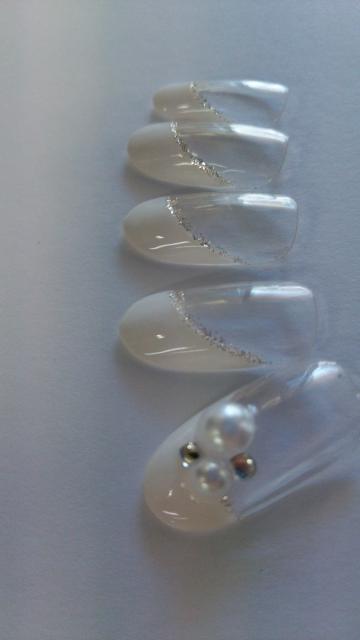 白フレンチにパールを乗せて。斜めのデザイインは爪を長く見せてくれる効果があるので短い爪の方にもおすすめです。